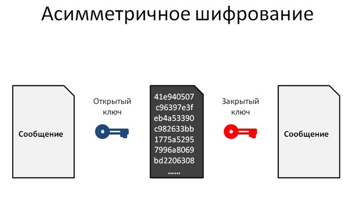 Асимметричное шифрование использует другой, более сложный принцип. Отправитель кодирует сообщение при помощи открытого ключа, который был заранее известен от получателя. Закодированное таким образом сообщение принимает адресат, но какую-то информацию он может получить, используя закрытый ключ шифрования, известный только ему.