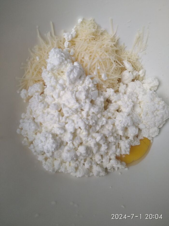Пармезан на мелкой терке трем, сыпем его в чашку к творогу и яйцу, добавляем оливковое масло, солим, хорошенько перемешиваем.