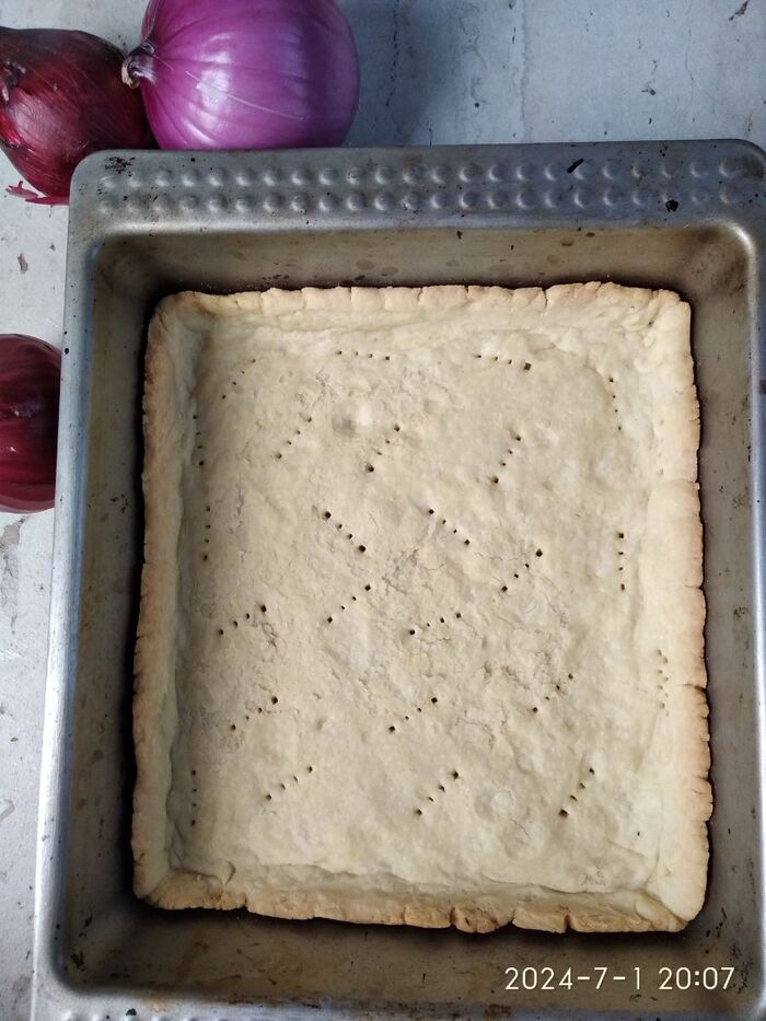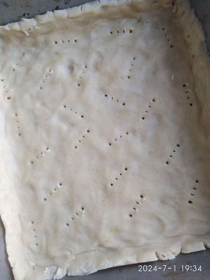 Тогда мы достали тесто, снова его помесили и когда оно снова стало пластичным, выложили в форму для запекания. Аккуратно разминая и равномерно растягивая от середины формы к краям, организуя небольшие бортики. Накололи вилкой тесто и отправили на 10 минут запекаться.