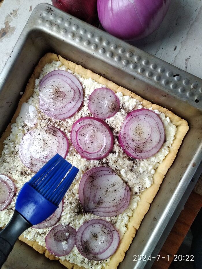 Затем достали, дали чуть остыть, выложили в эту основу для пирога нашу творожную начинку, сверху разложили нарезанный тонкими кольцами красный лук, смазали все это небольшим количеством оливкового масла, посыпали черным перцем и отправили обратно в духовку уже на 30 -35 минут.