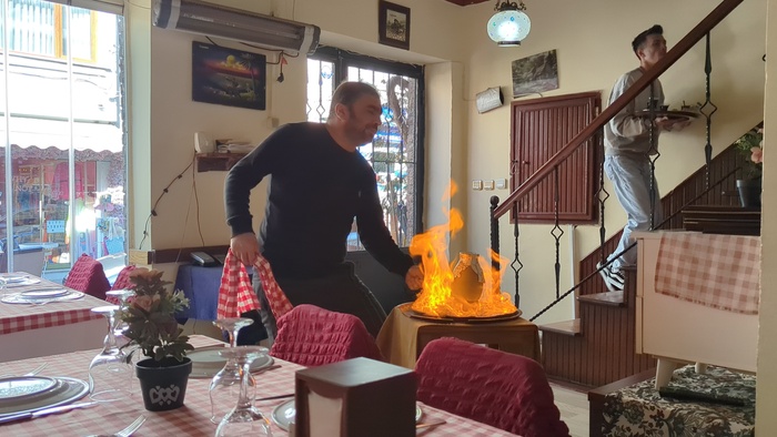 Под занавес дня пошли в ресторан, где все было вкусно. Блюда подавали в языках пламени и со вкусными помидорами.