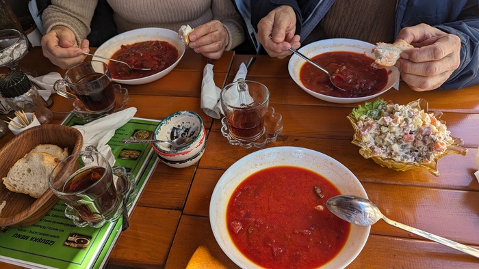 Нашли ресторан Русской кухни, где поели Украинского борща. Хозяйка- Ирина из Ялты. Готовит, обслуживает, убирает. Все сама. Было вкусно. Реклама: ресторан Избушка. Там вкусно!