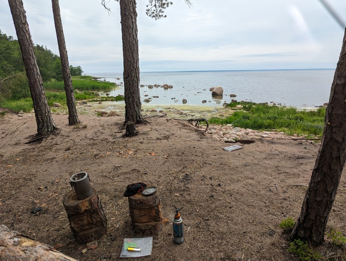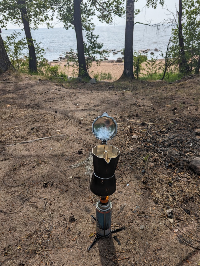 Нахожу похожий поворот к заливу. Не то место. Со второго раза угадываю. Вместе со зрителями точно определяем местность. Обстановка отличается - нет тех пеньков, на одном из них я забыл ложку, предположительно. Видимо, сожгли туристы. Ложки нигде нет. Осмотрел деревья (может овой горелке. Взял доширак вместо риса - там внутри вилка, будет какой-то столовый прибор - вскто на крючок повесил), поковырялся в песке. В это время я готовил еду в пароварке на газё лучше, чем есть ножом или руками). Сварил кофе в гейзерной кофеварке. А про ложку решил забыть.