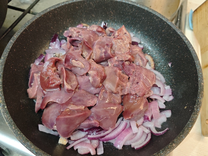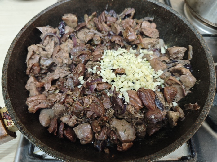 5. Пассируем 1-2 минуты лук и добавляем к нему мясную «соломку». Перемешиваем. Солим-перчим.
