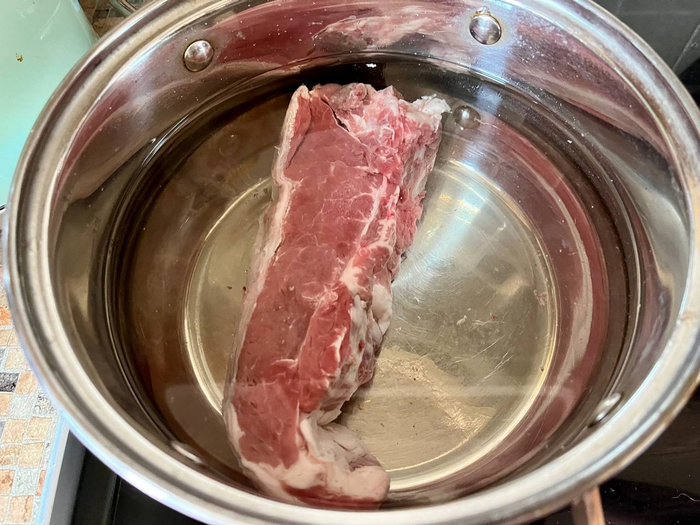 В чистую кастрюлю - наливаем воду, туда мякоть коровы, воды налейте половину, мы будем долго мякоть варить, почти тушить мяско. Чтобы оно было нежное и на волокна расходилось. Можно было бы и в мультиварке, но там бульон костный.