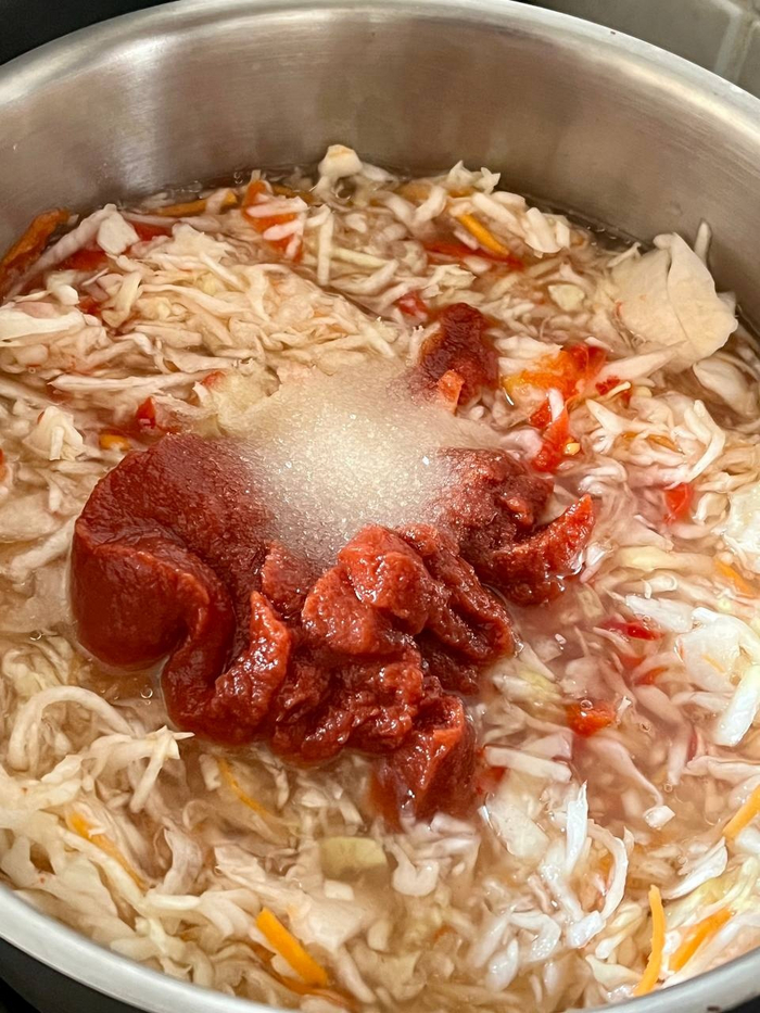 Капусту пробуем, жмуримся, проглатываем образовавашиеся слюни. Капусту в сотейник, будем ее тушить. Добавляем томатную пасту, ложку сахара. Не солим. Тушим долго, около часа-полутора, добавьте костного бульона. Чтобы постоянно была жидкость.