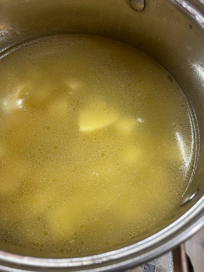 Картофель кусками, варим так же как пюре, но варим на костном бульоне. Я туда же кинул морковь желтую, у меня такая была. Но лучше все таки разделить - т.к. пены было много и замучался снимать ее.