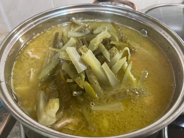Вообще огурцы принято почистить, но это относилось к большим огромным огурцам, а не к нашим маленьким огурчикам. Поэтому режем соломкой и не паримся. Важно - рассол процеживаем, его можно и чуть прокипятить, у нас заводской, кипятить не будем. Но заливаем, только когда уже все готово. Я налил сначала рассол от соленых, мне кислоты не хватило - поэтому долил от маринованных огурцов. Тут на ваш вкус. Проверяем - ложка стоит, значит суп удался.
