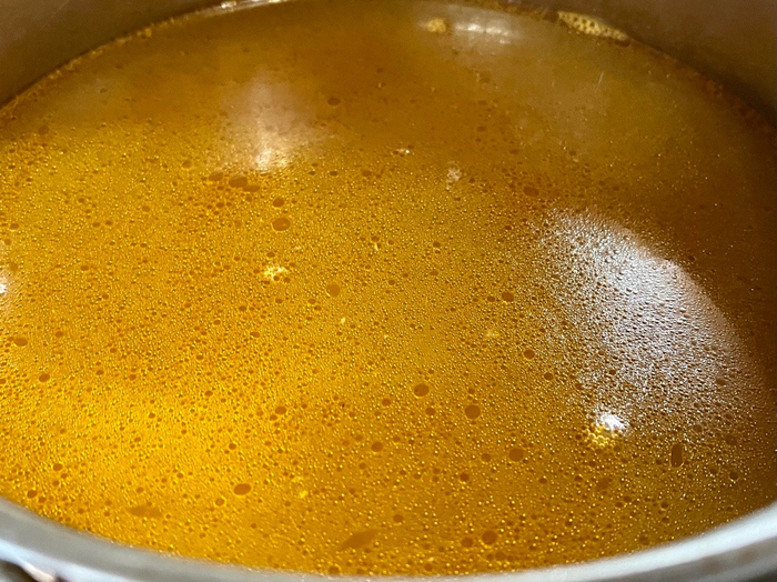 Даем бульону закипеть - ставим на минимальный огонь и забываем на 4 часа. Кастрюлю не накрываем.