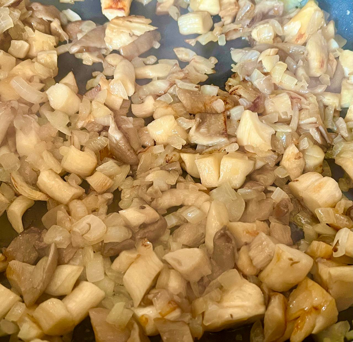 Нарезаем лук - достаем грибы. Наливаем в сковородку, да-да, опять костный бульон - он жирный, на нем жарим лук и добавляем чуть позже грибы. Обжариваем до красоты.