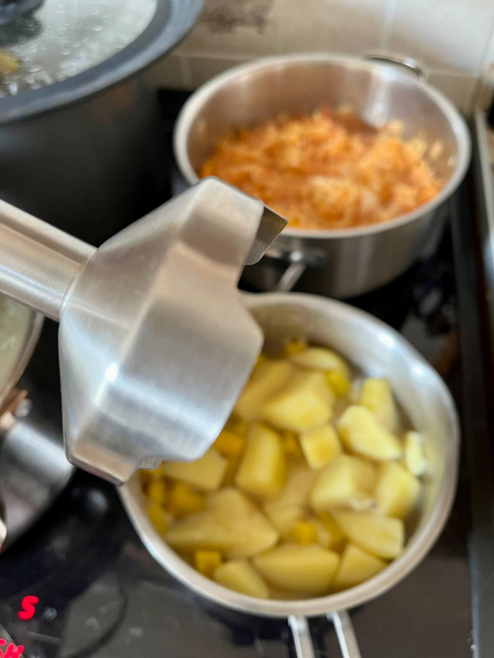 Достаем блендер или мялку для картофеля, нам нужно пюре. Есть другой вариант, тогда картофель в суп просто кубиками, а загущаем с помощью муки.