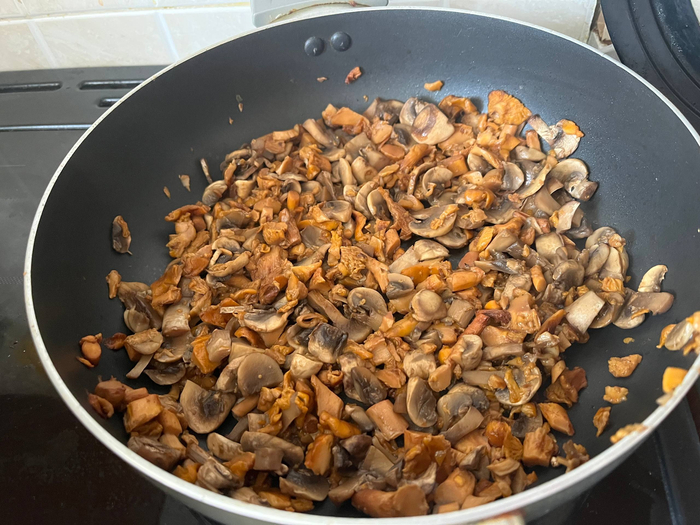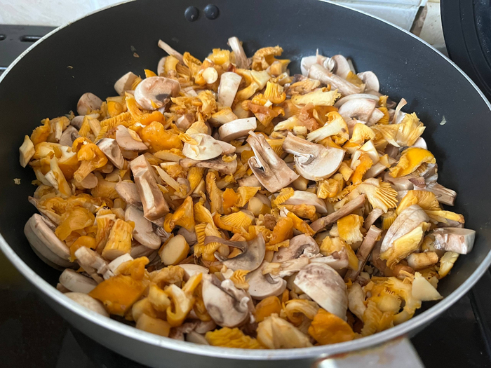 Грибы, шампиньоны и лисички, режу мелко и много, целую сковороду, нам надо чтобы оттуда вышла влага. Эти твари при жарке сначала выделяют влагу, потом ее как губка забирают.