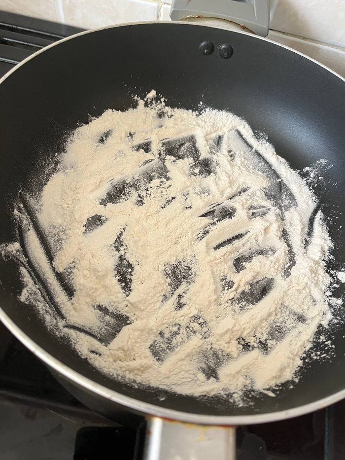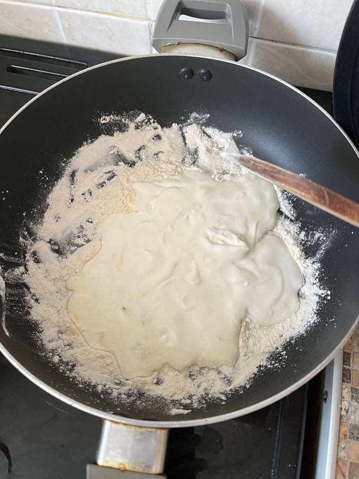 Далее. Берем муку, две три полных ложки и сметану. Муку греем на сухой чистой сковороде, она начнет приобретать золотистый оттенок. Сметана, тут не экономьте как я, надо много сметаны. Я взял маленькую и чуть не просрал весь суп. Когда мука подзолотилась, надо снизить огонь и добавить сметану, из-за того, что у меня ее было мало, стали консистенция омлета, так быть не должно. Надо жидкое состояние и температура, при которой сметана не свернется. У меня она не свернулась, но консистенция была плотнее чем надо, благо, рецепт позволяет такую ошибку и все расходится. И разошлось у меня.