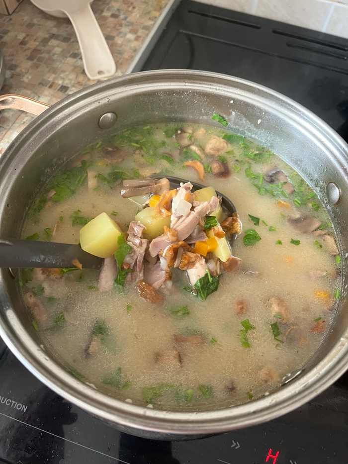 Итак, в кастрюле у нас, прекрасный бульон, который загущен сметаной и мукой, с мясом курицы, грибами, картофелем и пассированными лук и морковью. Даем ему постоять, чтобы все обменялось вкусами, режем петрушку и закидываем ее в кастрюлю.