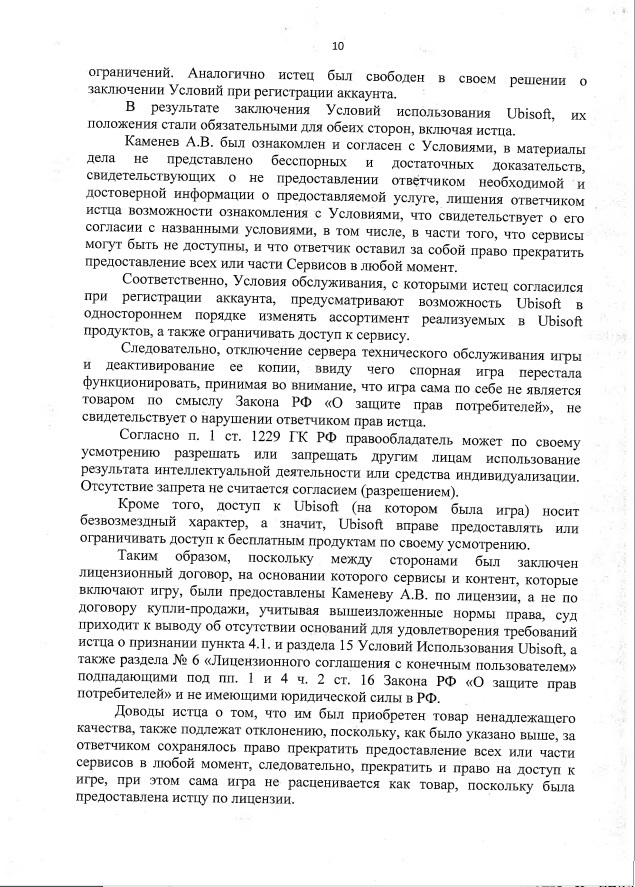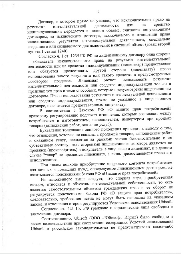 1) суд кассационной инстанции вслед за судом первой и апелляционной инстанций сослался на лицензионное соглашение Ubisoft, не обратив надлежащего внимания на то, что этот документ по причинам, изложенным в исковом заявлении, утратил юридическую силу по отношению к видеоигре The Crew, и не мог быть применён при рассмотрении моего спора с Ответчиком;