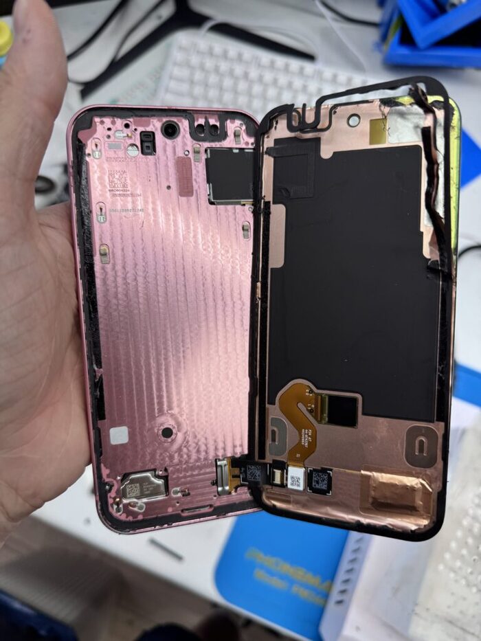 Для начала нам нужно зафиксировать дисплей. Спереди у нас разбитие, а сзади у нас шлейф матрицы, и он просто не поместится на сепаратор, но мы сделаем финт ушами и отогнём шлейф матрицы, отклеив его от подложки.