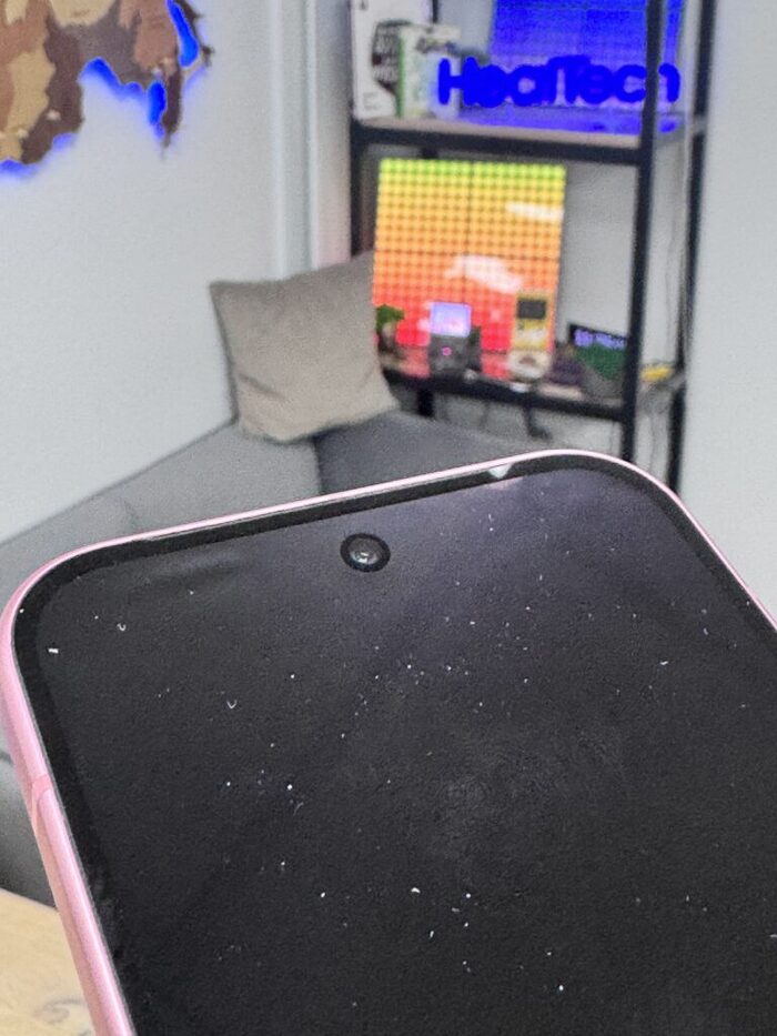 На нем есть мелкое пятнышко слева на внутреннем дисплее, но оно владельца особо не заботит, потому что с внешней стороны дисплей выглядит намного хуже)