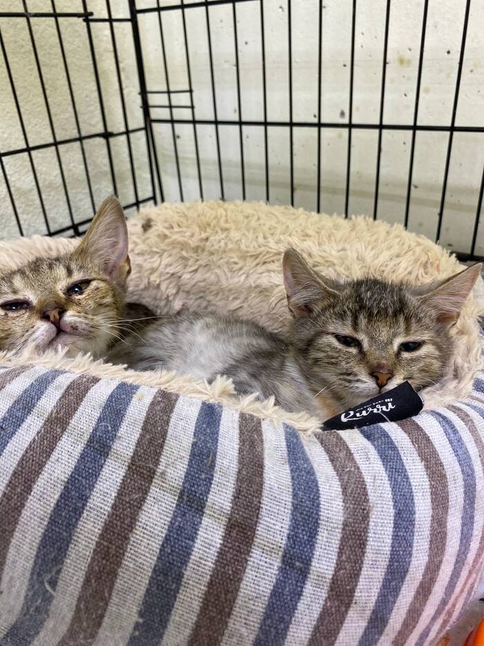 Айва, шпротина с очень больными глазками и ужасный дистрофик, видимо, ей совсем не доставалось еды от прохожих…в то время как Груша чуть здоровее на вид, но тоже с явными признаками респираторных заболеваний.