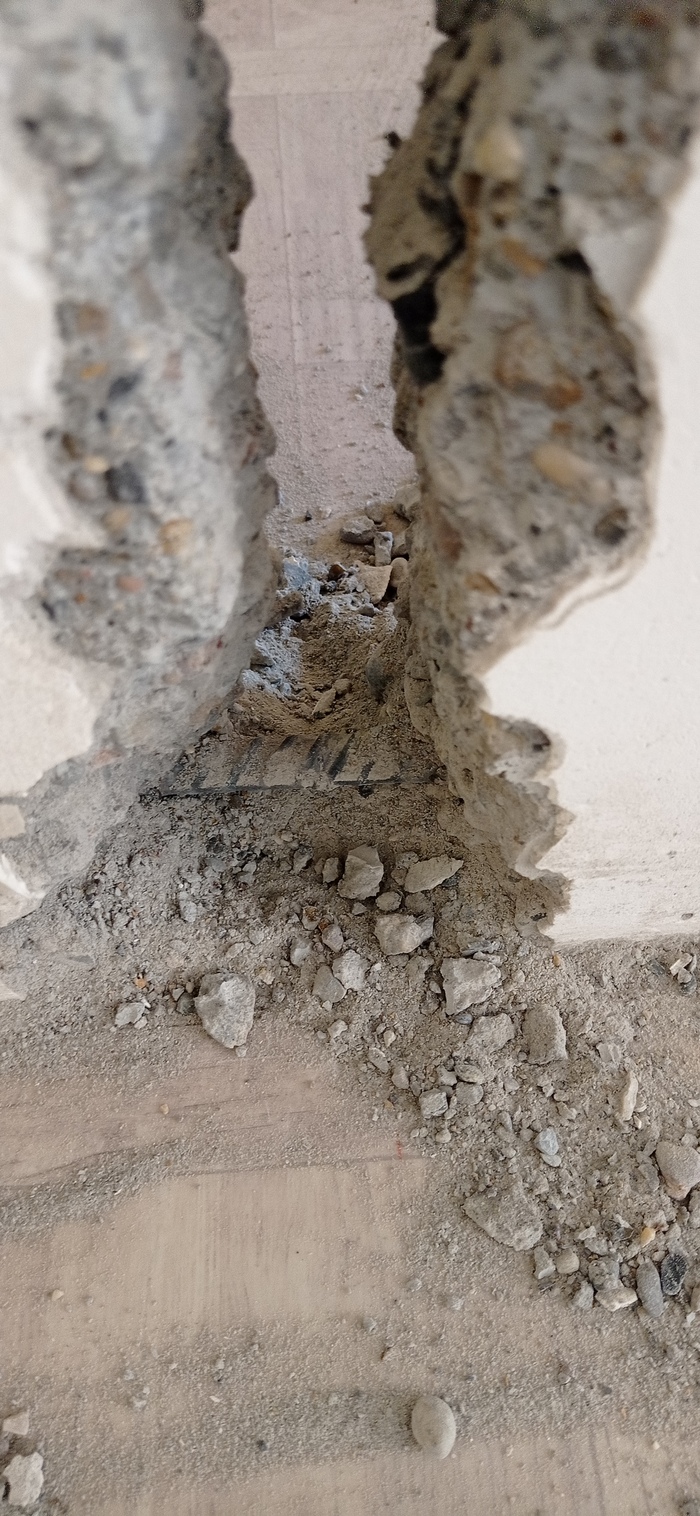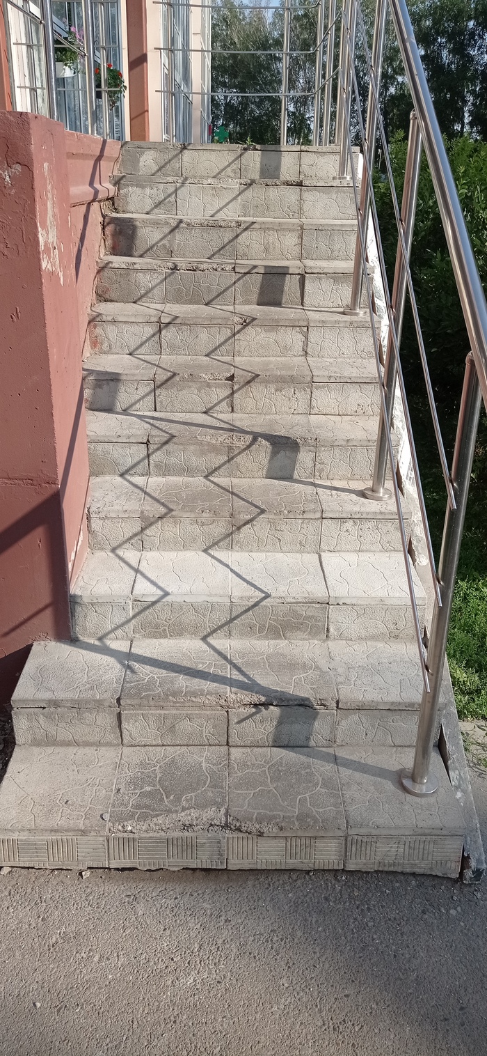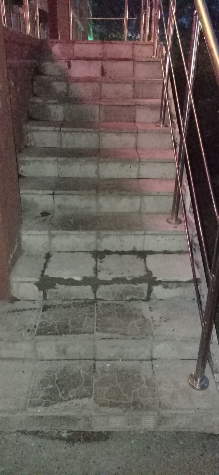 От бетонной лестницы отвалилось несколько плиток. Плитка "серая тучка". Еë до меня, судя по всему, уже ктото пытался ремонтировать, но не столь успешно это вышло. Просто взять и приклеить обратно не получилось, так как не сходилась геометрия с другими плитками. А посему пришлось перфычем сбивать всë лишнее, получилось так: