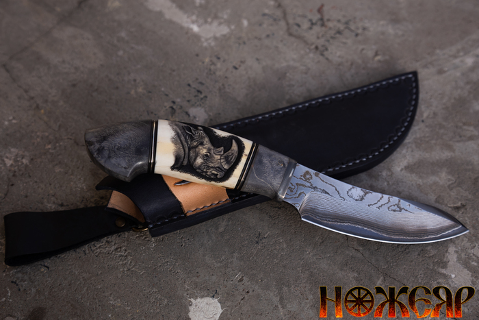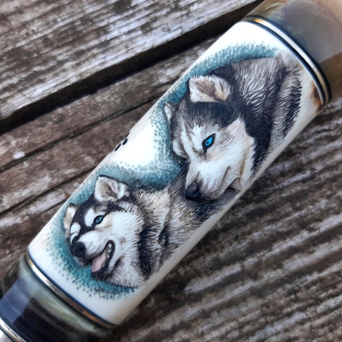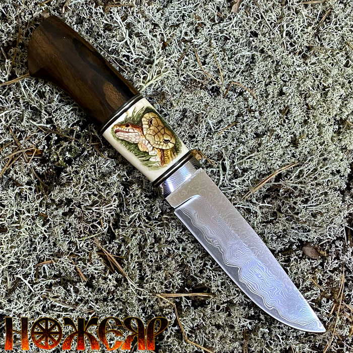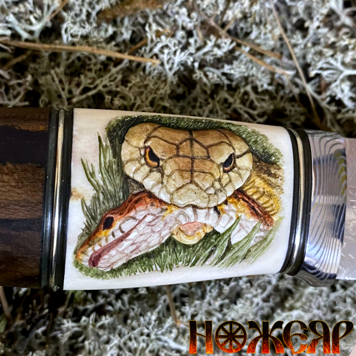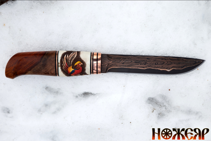 Материал рукояти - морадо, лосиный рог, по рукояти выполнена объемная резьба с последующим колорированием акриловыми красками, проставки из бронзы и фибры