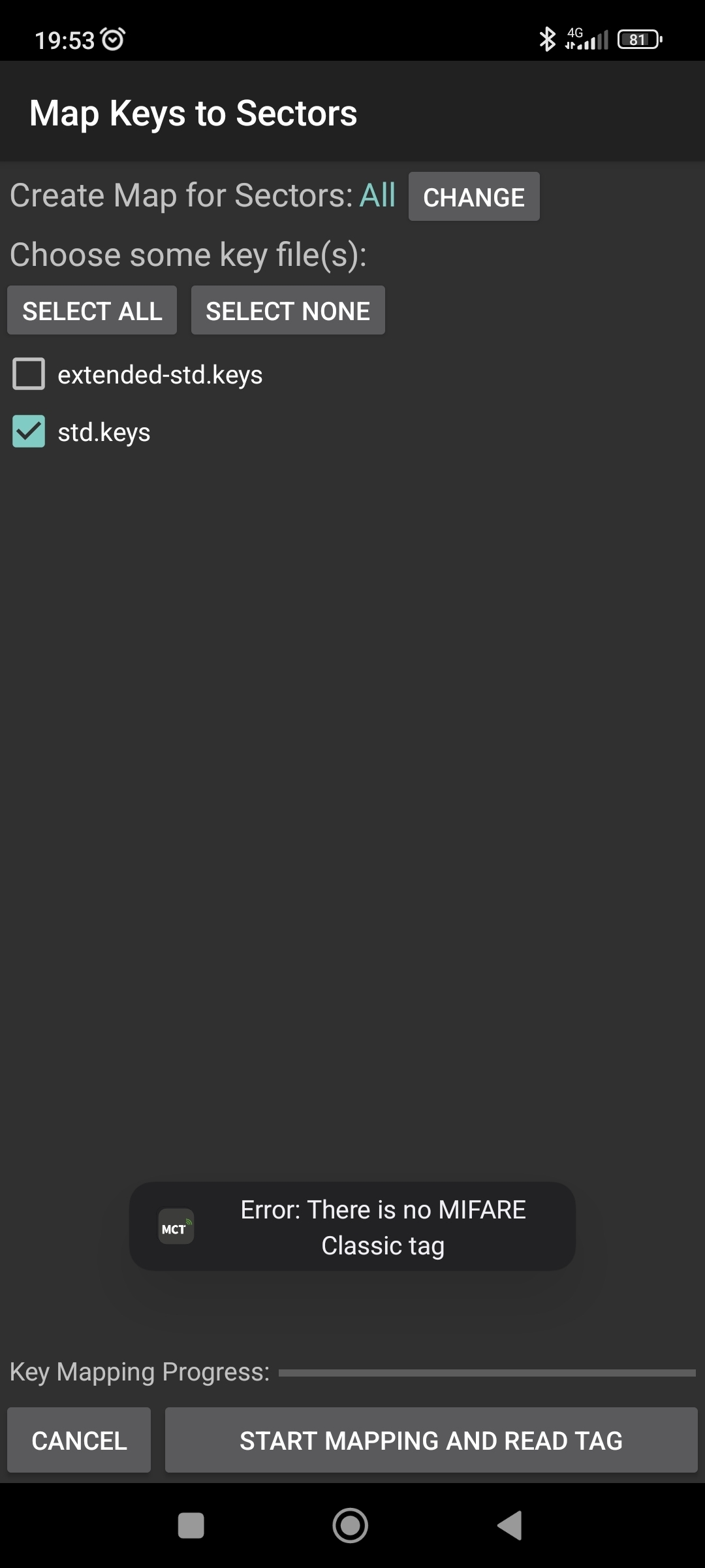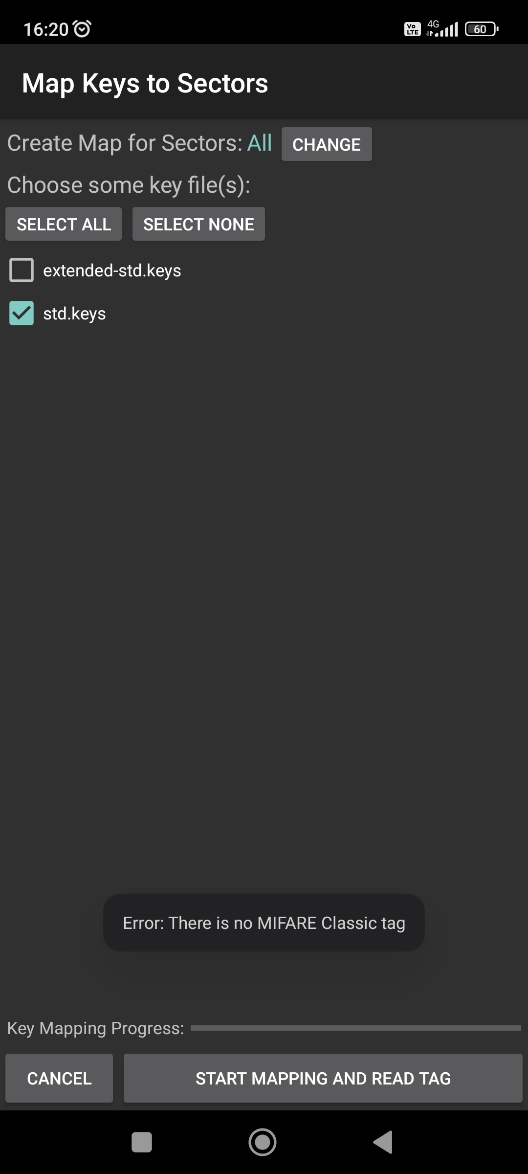 Заходим, жмём кнопку Read tag. Выбираем пак ключей std, прислоняем карту и жмём Start mapping and read tag. Карточку от телефона не отводим пока не откроется следующая кракозябра: