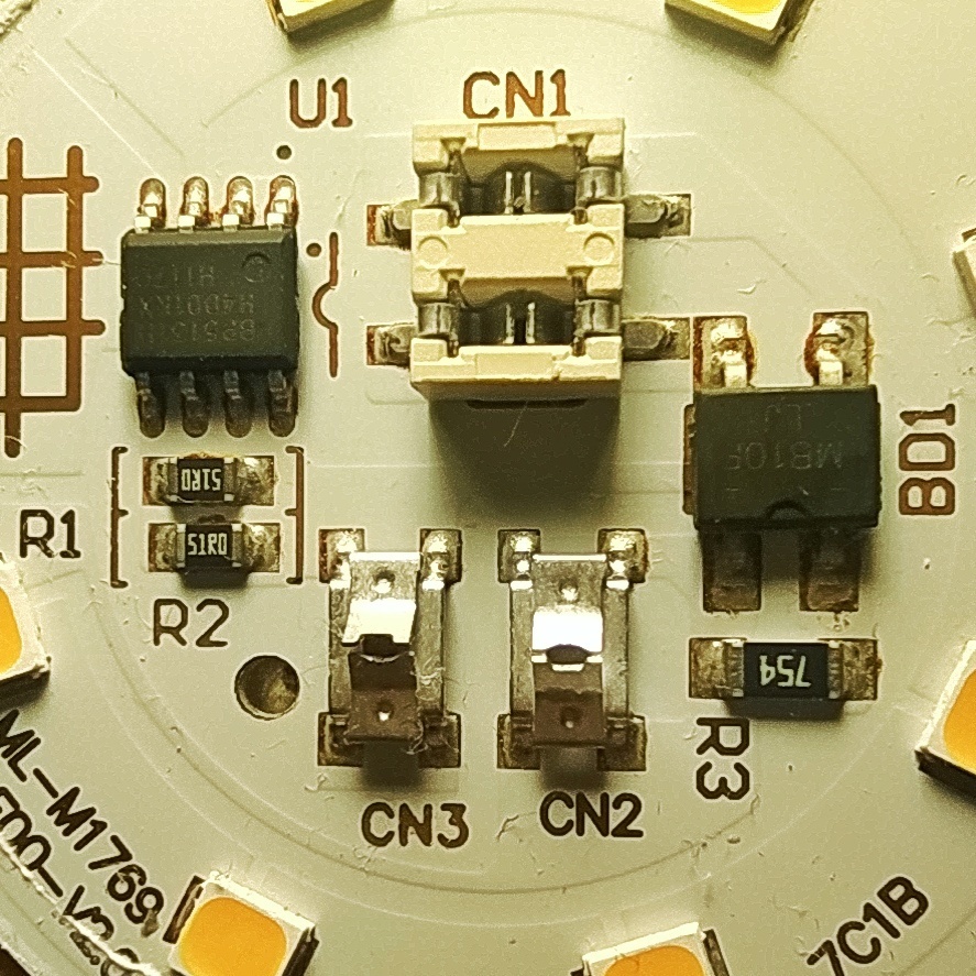 Первым делом снимаем колпак. У этой лампы его можно просто оторвать рукой (потребуется большое усилие). Под колпаком единая плата. На ней нас интересуют резисторы R1 и R2, они задают ток светодиодов.