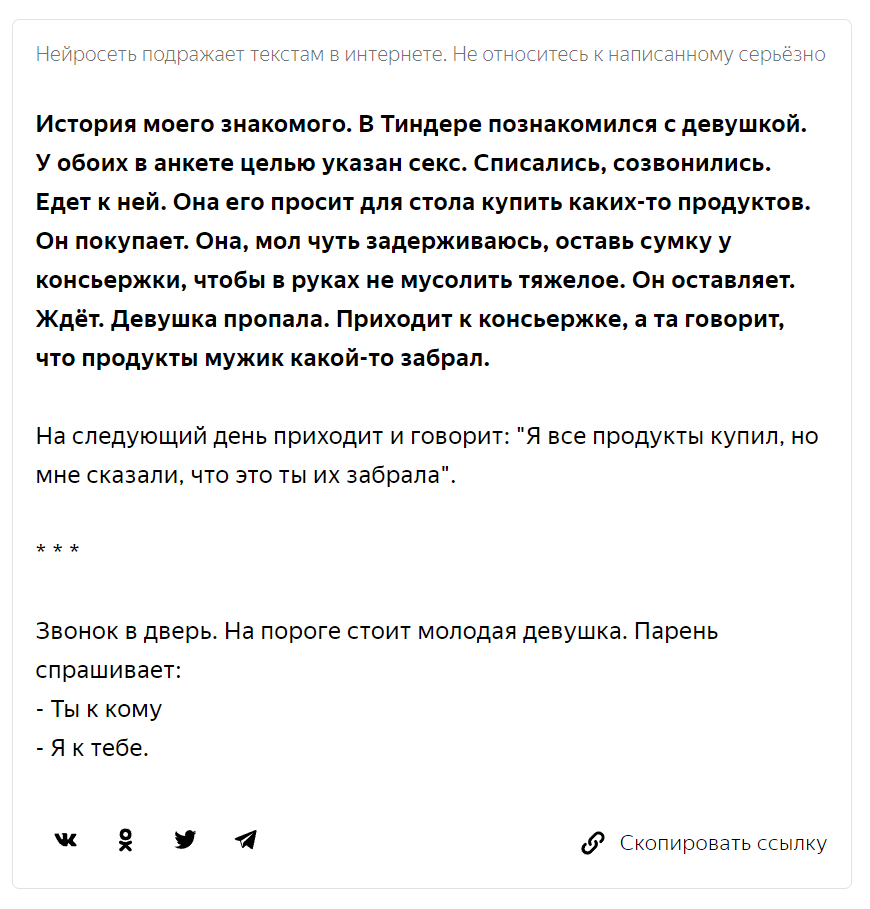 История моего знакомого. В Тиндере познакомился с девушкой. У обоих в анкете целью указан секс. Списались, созвонились. Едет к ней. Она его просит для стола купить каких-то продуктов. Он покупает. Она, мол чуть задерживаюсь, оставь сумку у консьержки, чтобы в руках не мусолить тяжелое. Он оставляет. Ждёт. Девушка пропала. Приходит к консьержке, а та говорит, что продукты мужик какой-то забрал.