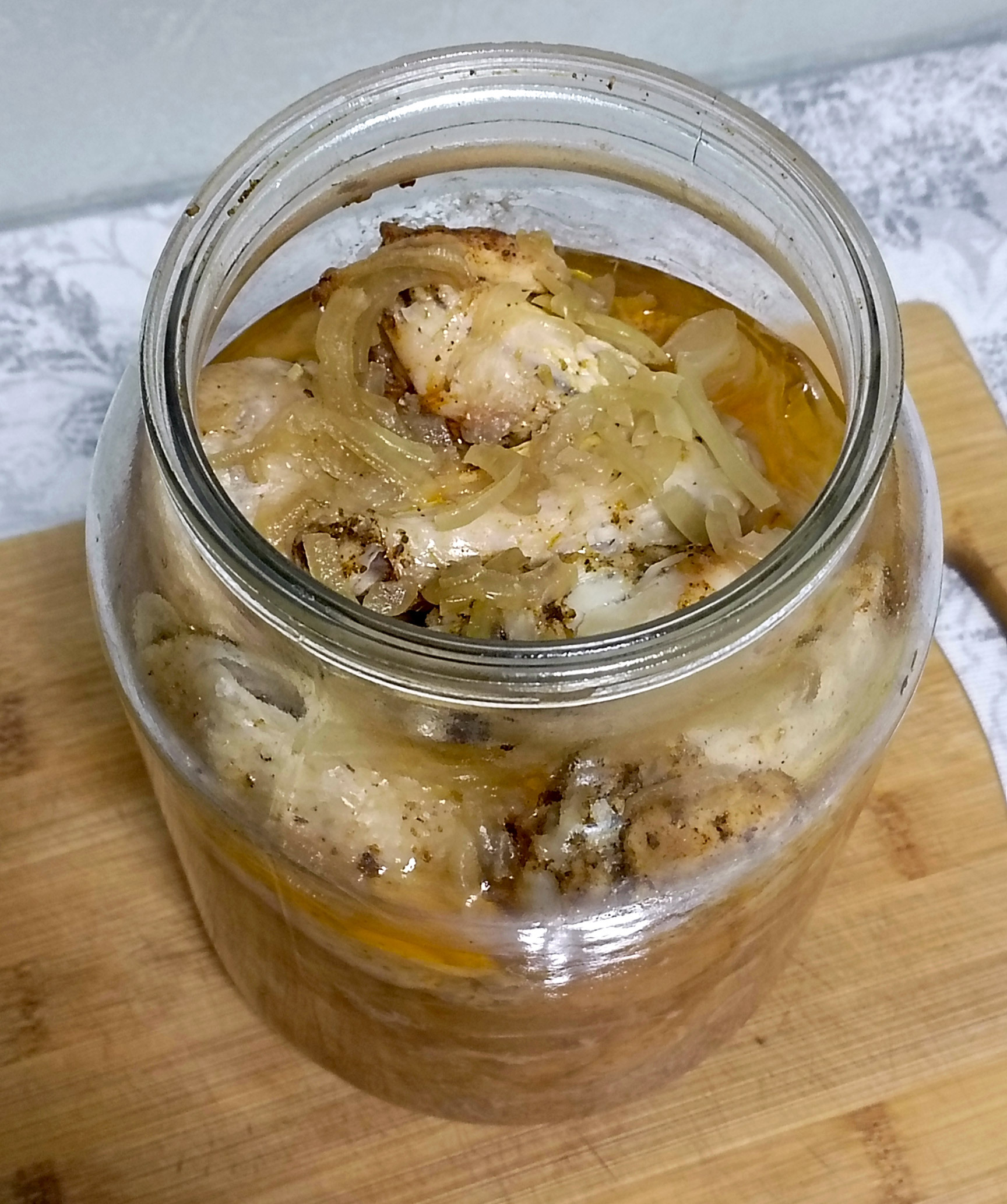 Приготовленная таким образом курица хранится в холодильнике прямо в банке очень долго.