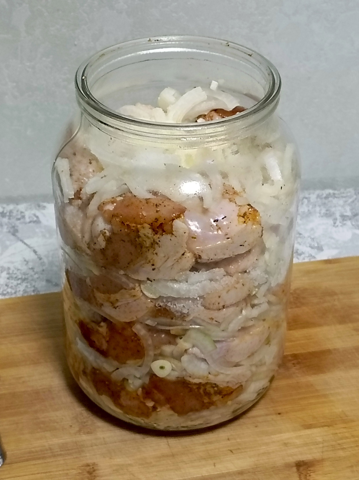 Потом опять слой лука с чесноком, слой курицы, соль, и так далее, пока банка не наполнится. Обязательно оставляем 5-7 сантиметров пустого пространства — будет выделяться сок и ему совершенно незачем переливаться через край банки.