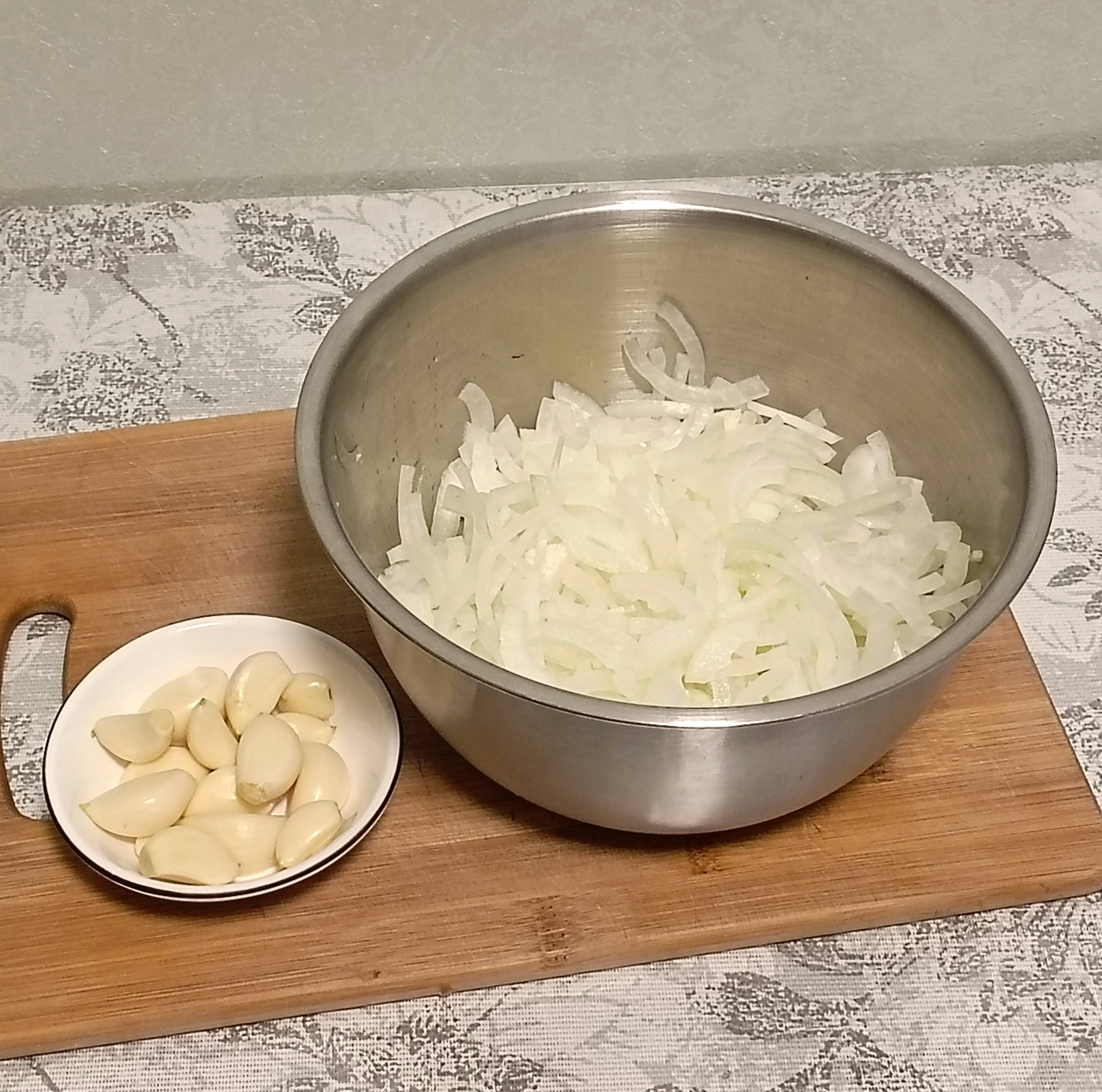 Режем «четверькольцами» лук, чистим чеснок. Чеснок можно забрасывать дольками, а можно порезать их на несколько частей — как вам больше по сердцу.
