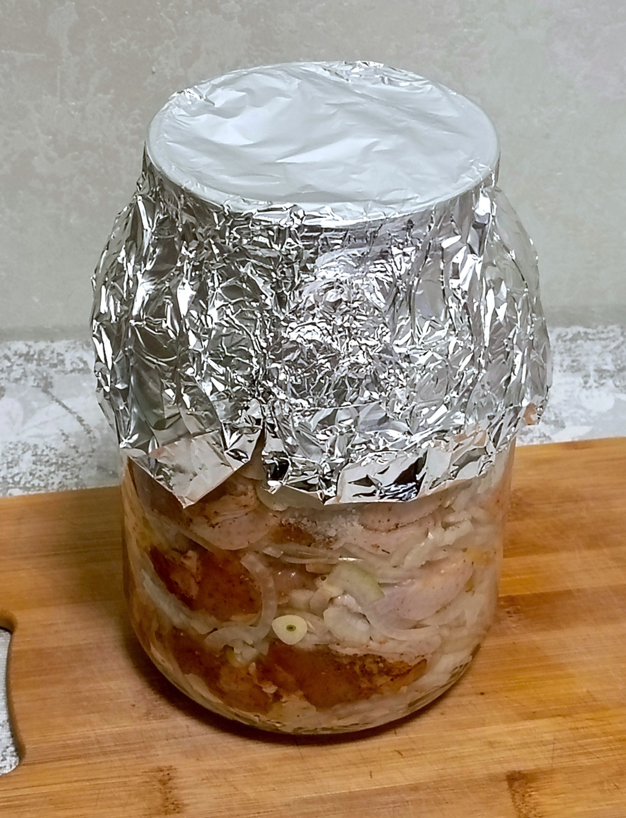 1. Банка 2-3 литра — с широким горлышком, чтобы пролезала рука и крупные куски курицы.