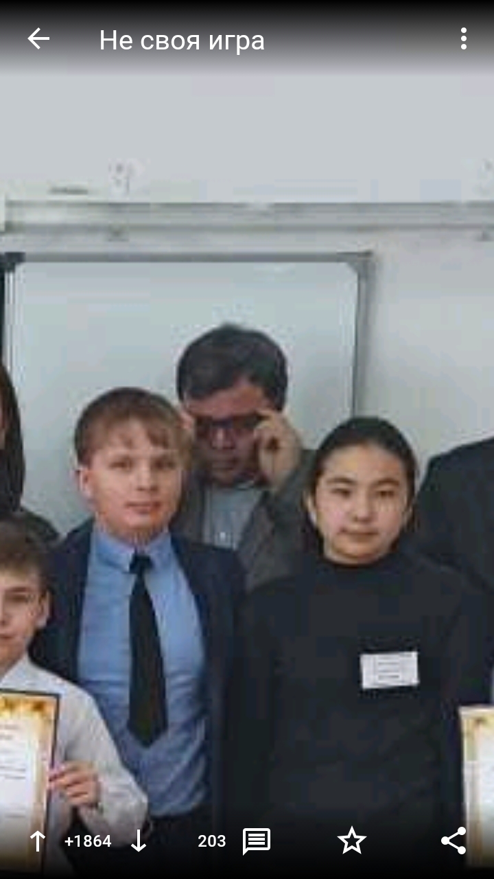 Все учителя сидели позади игроков и при этом вопросе начали недоумённо переглядываться. Я сидел рядом с коллегой по имени Миша. "И какой же это памятник?" - тихо спросил он у меня. "Честно сказать, я и сам не знаю, - ответил я, - там вроде, кроме памятника Куйбышев и Ленина, не было никого...". В это время послышался шёпот Сани: "Милана, скорее!". И вот наша табличка снова в гордом одиночестве. Тут раздаётся вопль Саньки: "Я знаю! Это паровоз!». Паровоз, кстати, на нашей станции действительно стоит, но о том, что он посвящён освоению Целины, вот лично я даже никогда не подозревал. К счастью, этот ответ оказался правильным. Мы победили, были награждены грамотой и поездкой в областной центр. После награждения, коллега Миша подошёл к нам и спросил Сашу: "Слушай, малый, а откуда ты знаешь, что паровоз посвящён покорению Целины?". Коллеги и участники игры, окружавшие нас, затаили дыхание в ожидании ответа. Саня пожал плечами: "Так вот же, стенд висит в музее, там написаны все памятники, посвящённые Целине в нашем районе. И паровоз первый, вместе с фото!». «Как всё просто то!», - засмеялась стоящая рядом женщина из местной районой школы. И добавила: "Ну что ж, желаю вам удачи в финале! Мне кажется, что с таким парнем вы вполне можете победить и там!". Однако финал игры, назначенный на середину марта, был отменён из-за вспыхнувшей пандемии коронавируса, к большому сожалению для моей команды. В итоге «Своя игра» стала для нас не своей. Фото Сани(в центре), а так же пресловутого паровоза прилагаю.