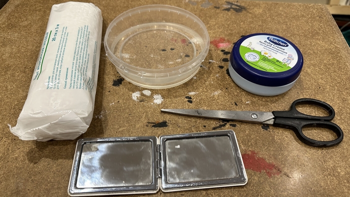 Гипсовый бинт, вода,жирный крем. Первым делом мы просто обязаны смазать наши бровки слоем крема потолще, ну это если мы не хотим остаться без них. В идеале, конечно, обмотать голову пищевой пленкой, но этого я не делала, и немного пожалела. Да. Далее разрезаем бинт на небольшие куски, и помним о том, что он безумно сыпится, будьте готовы к тому, что в гипсовой пыли будет ваша комната, вы, собака, весь мир. Далее мочим каждый кусочек в воде, и накладываем на свой фейс,оставляя глаза и ноздри