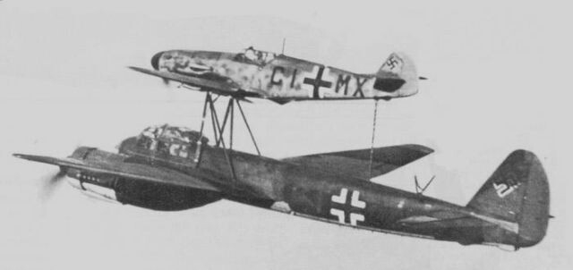 Здравствуйте, уважаемые читатели! Ещё в 1943 году враг воплощал в жизнь проект «Мистель», или, как его еще называли, «Папа и сын», с моей точки зрения, ужасное название, и дальше будет понятно почему. За основу брался истребитель с которого осуществлялось управление, к которому снизу крепился уже отработавший своё бомбардировщик Ю-88(носитель) на специальных креплениях, в носовой части которого закладывались две тонны взрывчатки, штырь на носу машины служил взрывателем. Во время выполнения задания лётчик должен был направить на цель заминированный корпус, отстыковав его во время пикирования под 30 градусов, когда расстояние до цели составляло около 3-х километров. Основная часть полёта проходила за счёт двигателей бомбардировщика(носителя). Вот такими девайсами немцы и планировали атаковать СССР в ходе операции «Железный молот».