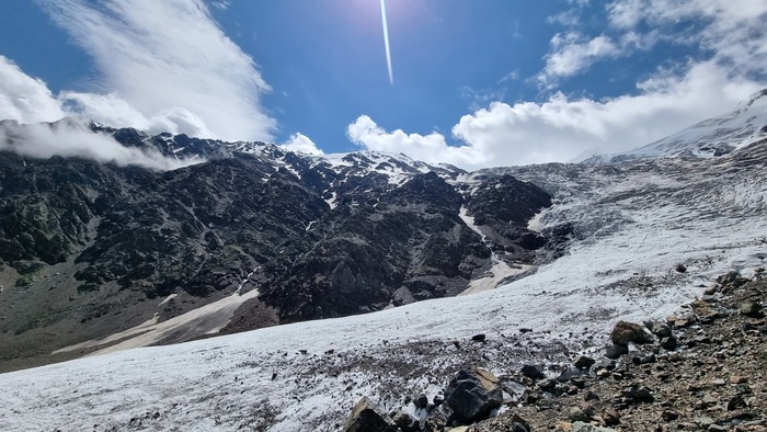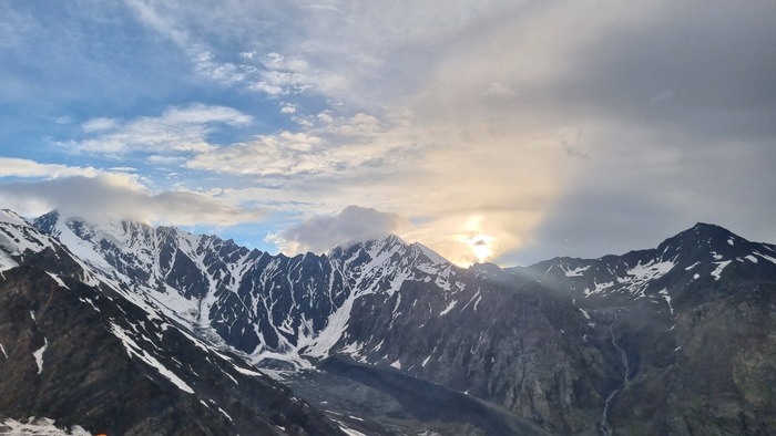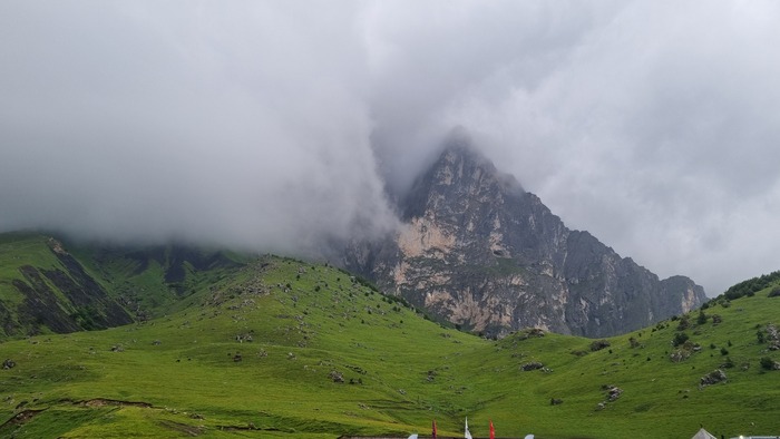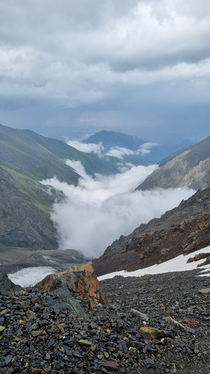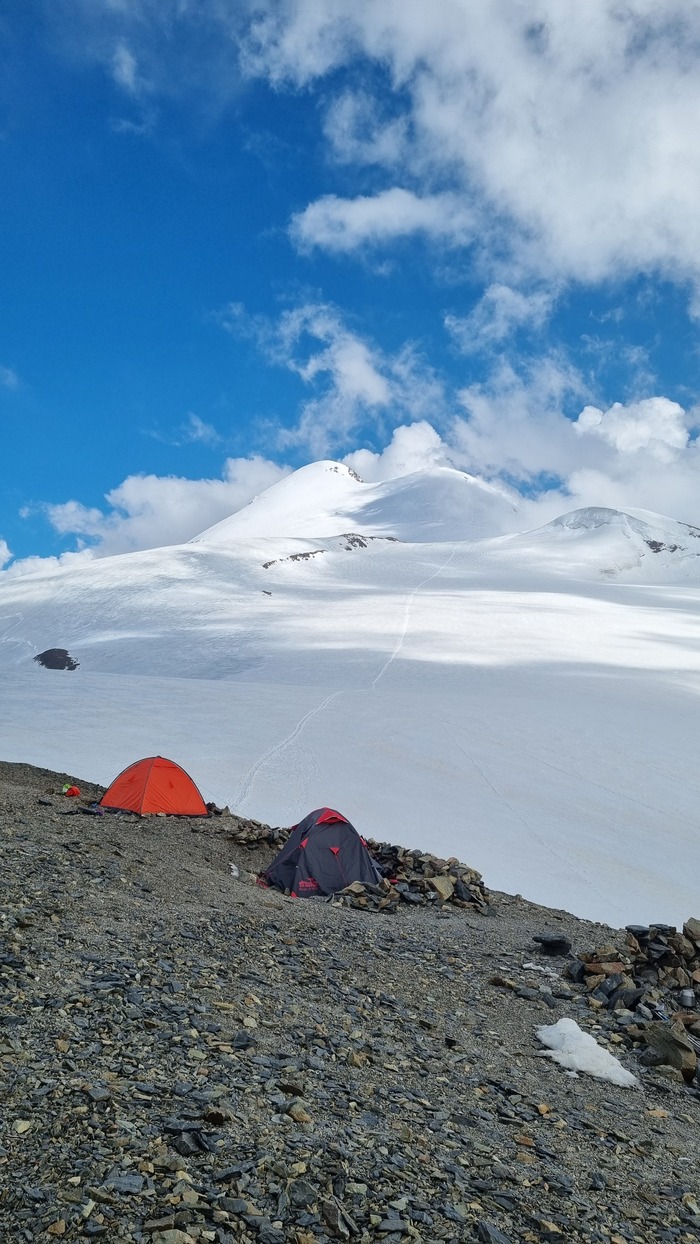 Казбек, который показал, что расслабляться не стоит. На высоте 4600 село облако, поднялся ветер, видимость снизилась до 15-20 метров и пошёл снег.