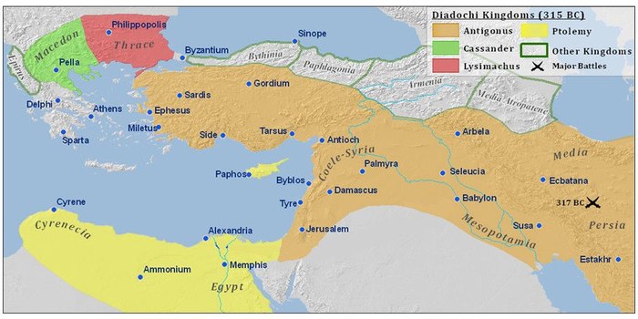 А после его смерти родосцы выпинали македонский гарнизон, вероятно, чтобы быть подальше от македонских разборок и дележек власти, и остров оказался вроде как предоставлен сам себе, а на деле прямо посреди борьбы, которую развернули военачальники великого македонского царя и полководца (Война Диадохов, 322-281 до н.э.), в частности Антигон Одноглазый (384-301 до н. э.) и Птолемей I Сотер (367-282 до н.э.). Причем симпатии жителей Родоса были, судя по всему, в основном на стороне второго, и Родос с Египтом связывали достаточно тесные и взаимовыгодные связи. Однако официально родосцы декларировали нейтралитет и даже отправили Антигону 10 своих кораблей для борьбы с Кассандром и его союзниками.