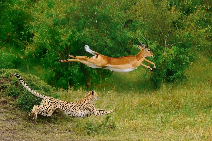 Во время завтрака в буше мы с моим гидом услышали шум, доносившийся с другой стороны равнины. Выглянув наружу, мы увидели стадо газелей Томсона, которые гнались за павианом с телёнком в зубах. Быстро сев в джип, мы отправились на место происшествия и увидели, как павиан бросил детёныша и сбежал от разъяренного стада.