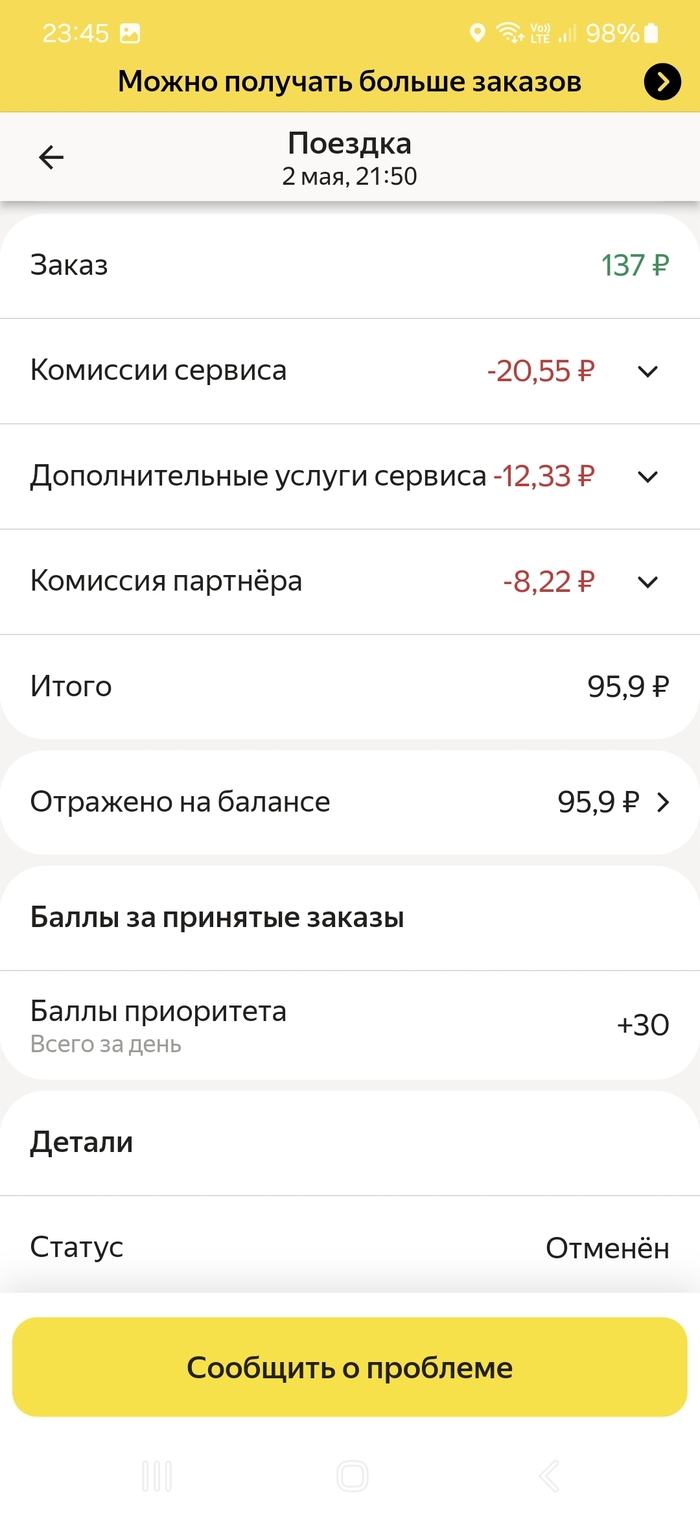 Заказ был отменён, и по правилам сервиса денежные средства должны были быть возвращены. Однако сначала они дважды были списаны у пассажира, а затем один раз возвращены.