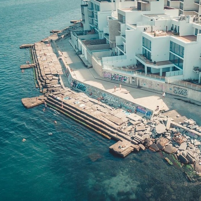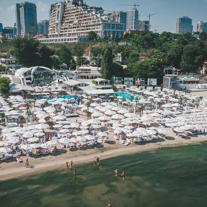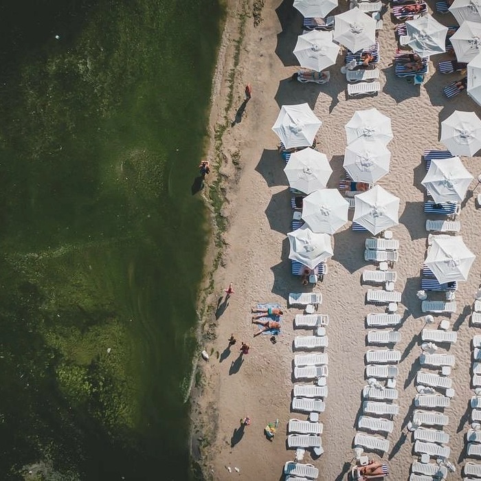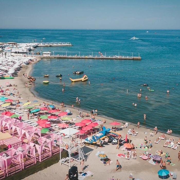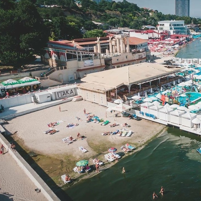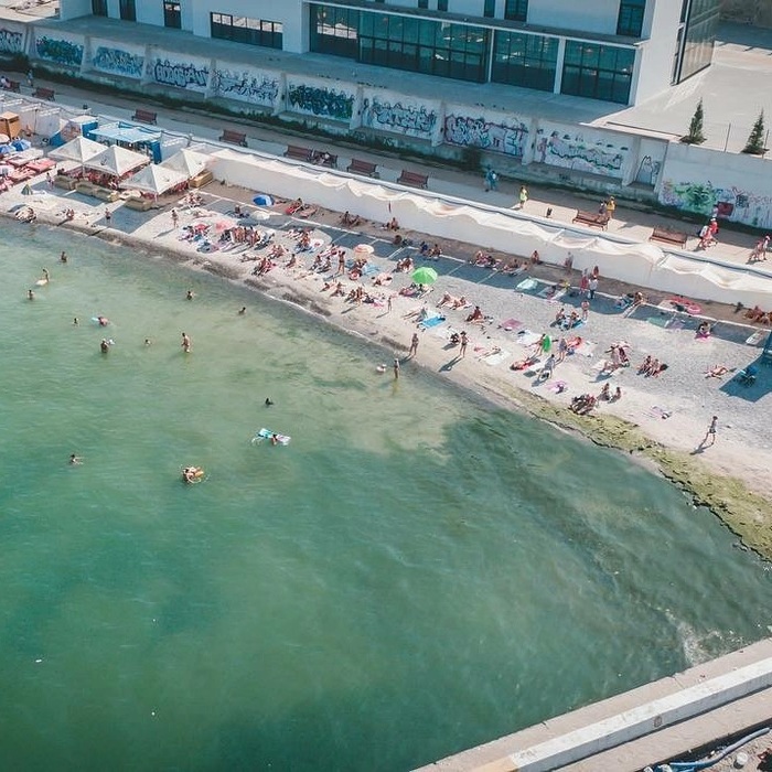 Обычно здесь наблюдается самый большой спрос на квадратные метры песка. Но, как видно на фото, сейчас свободные места есть. Бесплатный пляж у "Итаки" и плиты почти пустуют. Видимо, обилие водорослей в воде отбило у многих желание идти к морю.