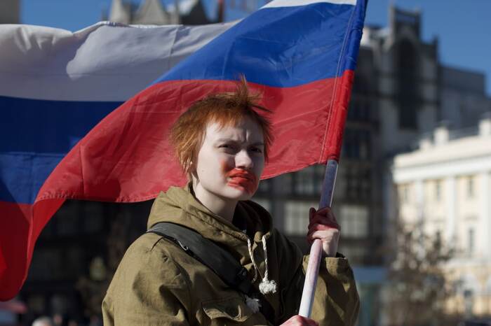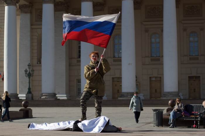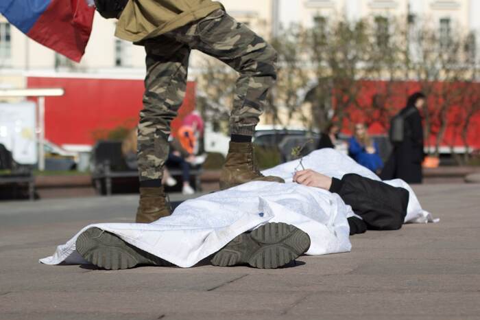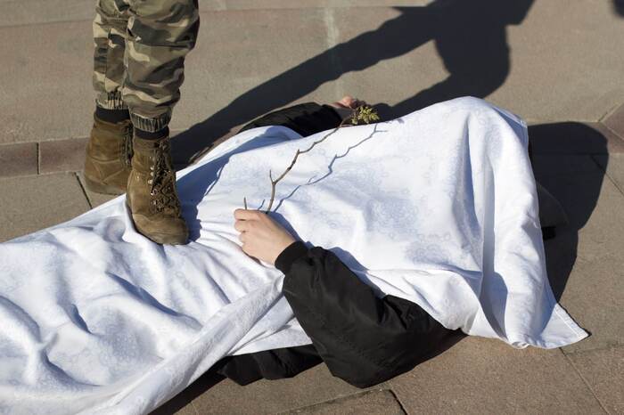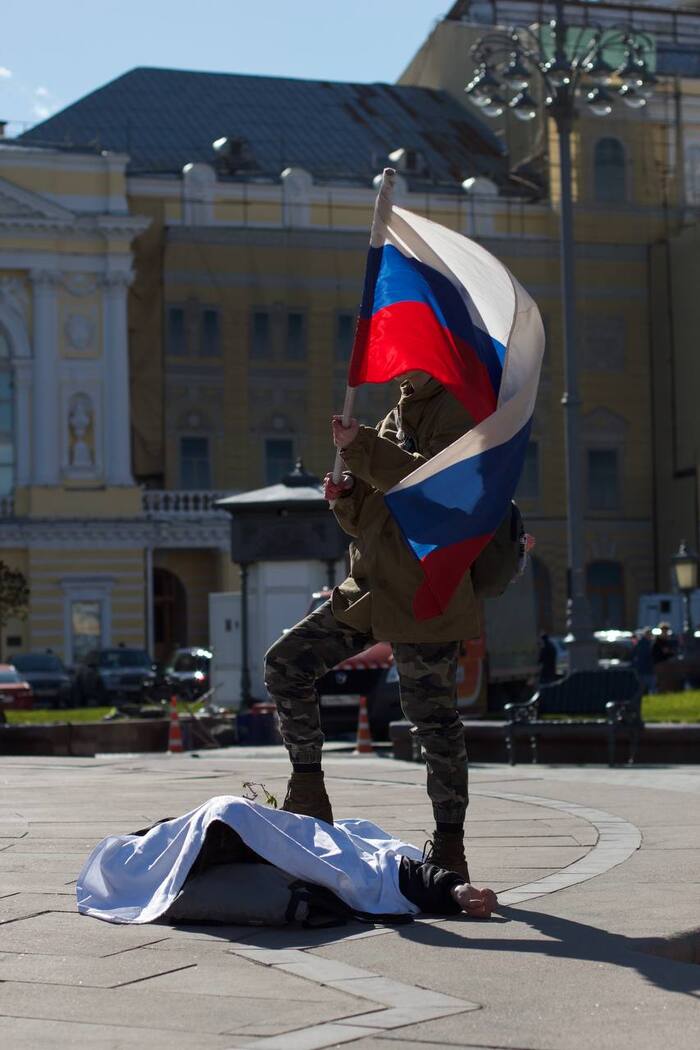 Одна из участниц «перформанса», переодевшись в форму российского военного, измазала свое лицо подобием крови и с триколором в руках наступила на «труп», который изображал другой «актер».