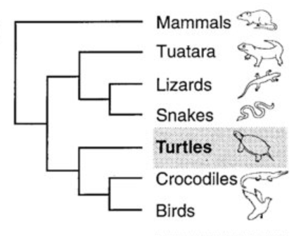 Далее крокодилы ближе к черепахам. Общее название крокодилов, черепах и птиц — архелозавры (в русскоязычной номенклатуре не используется).