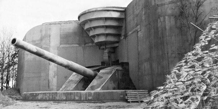 Военнослужащие армии США у захваченного каземата №1 батареи Крисбек. На снимке один из двух бункеров батареи с 210-мм орудиями Škoda. Восточное побережье полуострова Контантен, недалеко от деревушки Сент-Маркуф. Орудия батареи вели огонь по десантным кораблям в районе места высадки «Юта»