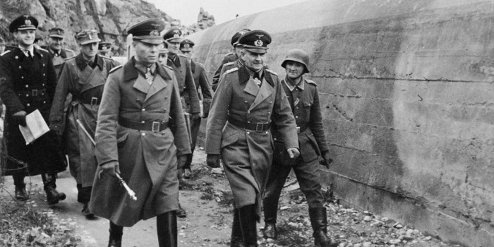 Генерал-фельдмаршал Эрвин Роммель инспектирует береговую оборону Нормандии. Оборона нормандского участка и других районов «Атлантического вала» была усилена именно под его руководством