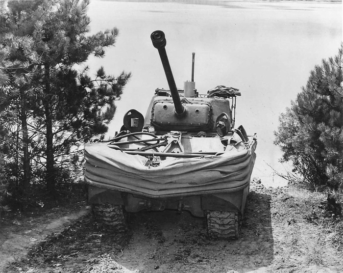 M4A1(76)W, переделанный в Sherman DD — ещё одна «игрушка Хобарта». Благодаря системе Duplex Drive (англ. «двойной движитель») танк был способен преодолевать водные преграды