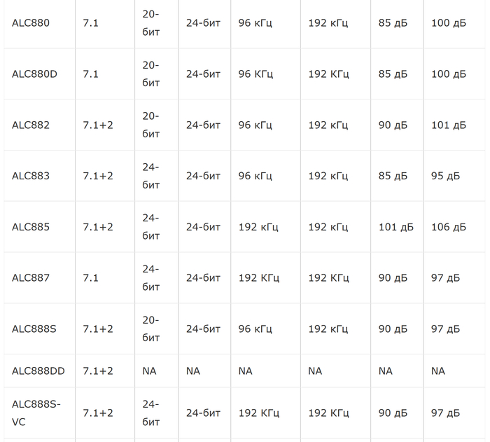 Однако данные кодеки и сегодня часто встречаются в бюджетных материнских платах. Во-первых, они дешево обходятся производителям. Во-вторых, их характеристики «на бумаге» не так уж плохи. Поддерживается вывод восьмиканального звука, 24-битная точность и частота дискретизации до 192 кГц. Однако соотношение сигнал/шум у этих моделей достаточно низкое — 95-97 дБ. При этом их комплектуют самой дешевой обвязкой. Так что чистого и громкого звука материнские платы с этими кодеками не выдают. Впрочем, чего еще ждать от самых бюджетных звуковых решений?