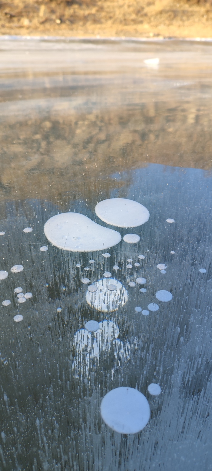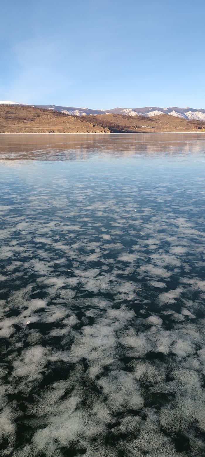 Отобедав мы поехали на озеро Нурское, на котором все делают эти вот красивые фото байкальского льда с пузырьками. Это связано с тем, что со дна озера постоянно поднимаются пузырьки газа, которые зимой, естественно, замерзают. Однако у нас лёд был сильно заметён (и этот снег не так-то просто расчистить, он прямо прилип ко льду), но, тем не менее, мы попытались сделать несколько фото.