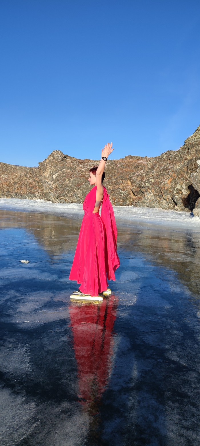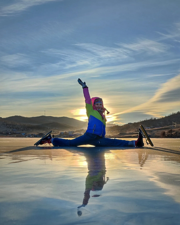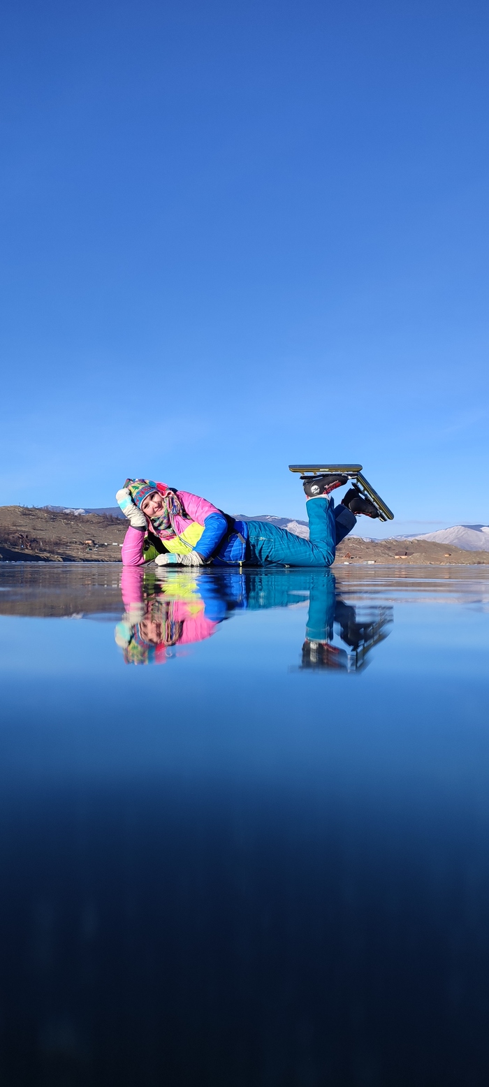 После Дракона мы поехали к бухте, в которой должен быть гладкий удобный для катания лёд. Проехали снова через залив Иркутская губа, в котором заканчивается ледовая переправа, это уже южная часть острова, а далее пересекли трассу, ведущую на Хужир, и добрались до бухточки с видом на большой Байкал и пролив Ольхонские ворота. Названия у этой бухты почему-то нет, но если кому-то интересно, то она прямо рядом с мысом Уншуй. Очень красивое место с гладким и прозрачным льдом. В общем, мы быстро натянули коньки и покатили.