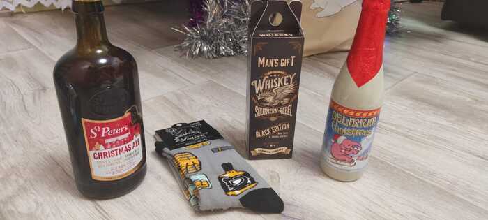 Свёрток говорит сам за себя. Открыв его, меня накрыло новогоднее настроение, парочка горячительных напитков (выпить пока не дали, стоят ждут своего времени), носочки весёленькие (особое спасибо) и даже средство для настоящих мужиков, которое пить не рекомендуется, а вот помыться не воспрепятствуется.