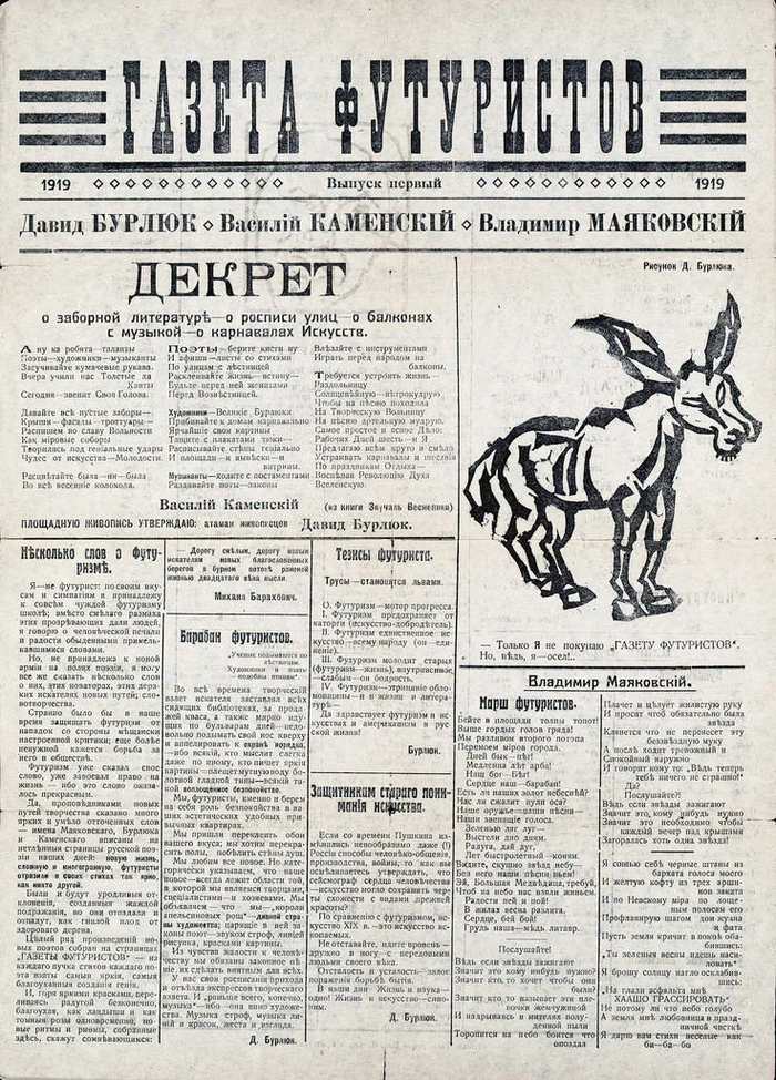 Однако, если говорить о чем-то близком к современному понимаю искусства, то стоит вспомнить Первый декрет футуристов за авторством Бурлюка и Маяка, в котором они в числе прочего пишут, что «Отныне … отменяется проживание искусства в кладовых, сараях человеческого гения — дворцах, галереях, салонах, библиотеках, театрах» и «Свободное Слово творческой личности пусть будет написано на перекрестках домовых стен, заборов, крыш, улиц наших городов, селений и на спинах автомобилей, экипажей, трамваев и на платьях всех граждан», а также «пусть самоцветными радугами перекинутся картины (краски) на улицах и площадях от дома к дому, радуя, облагораживая глаз (вкус) прохожего».