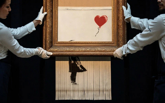 Работа Бэнкси. Уничтоженная Бэнкси сразу после продажи за 1.4 миллиона долларов (после этого продана за 25.4 миллиона).